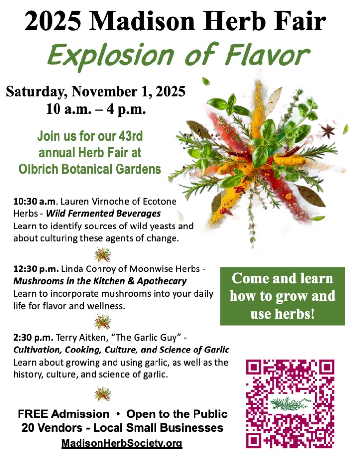 2025 Madison Herb Fair. Saturday, November 1, 10 a.m. to 4 p.m. Olbrich Botanical Gardens, 3330 Atwood Ave., Madison. Three speakers, herbal marketplace, Q & A table, free admission. Theme: “EXPLOSION OF FLAVOR.” More information at www.madisonherbsociety.org
